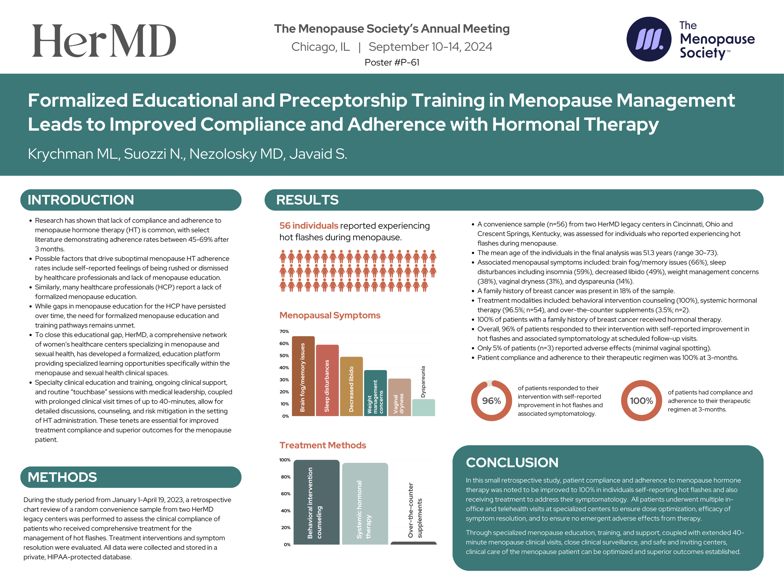 This retrospective review evaluated the impact of formalized menopause education and training for healthcare professionals at HerMD centers on patient adherence to hormone therapy (HT). Following structured clinical education, prolonged visit times, and comprehensive patient support, 100% of patients treated for hot flashes reported adherence to their HT regimen at 3 months, with 96% reporting symptom improvement. These findings suggest that enhanced training for healthcare professionals and patient-centered care significantly improve compliance and health outcomes in menopause management.